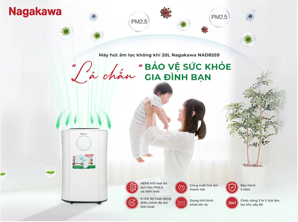 Máy hút ẩm lọc không khí Nagakawa NAD8559 là giải pháp hoàn hảo giúp chị em mình kiểm soát độ ẩm, bảo vệ sức khỏe gia đình và nâng cao chất lượng cuộc sống. Với thiết kế hiện đại, tính năng đa dạng và hiệu quả vượt trội, Nagakawa NAD8559 xứng đáng là "người bạn đồng hành" không thể thiếu trong mỗi gia đình