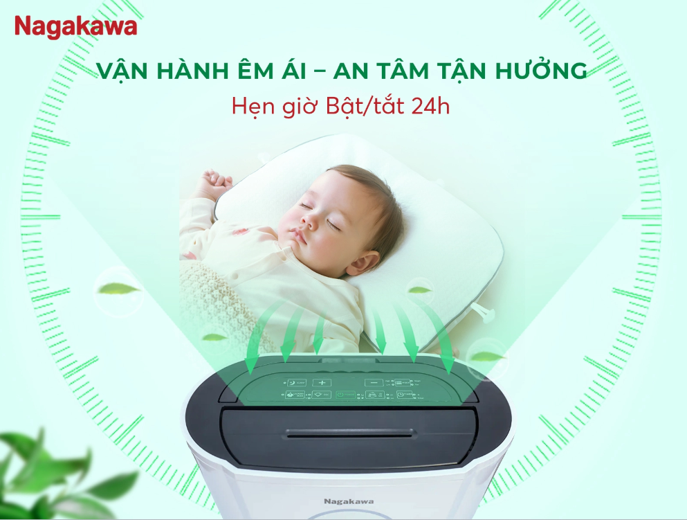 Bên cạnh đó, máy hoạt động ổn định, độ ồn thấp giúp máy hút ẩm Nagakawa hoạt động êm ái, không gây ảnh hưởng đến sinh hoạt và giấc ngủ của gia đình bạn.