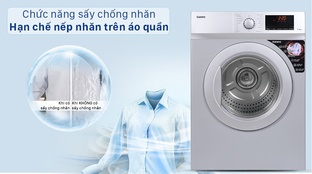 Với chức năng sấy chống nhăn thì sau khi kết thúc chu trình sấy, lồng sấy sẽ xoay đảo chiều nhiều lần. Nhờ vậy giúp hạn chế nếp nhăn, nếp gấp trên quần áo, tiết kiệm thời gian là ủi sau khi sấy cũng như bảo vệ quần áo bền hơn.
