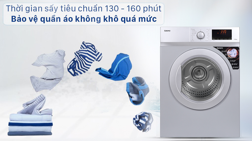 Thời gian sấy tiêu chuẩn 130 - 160 phút sẽ bảo vệ quần áo của bạn tốt hơn, đảm bảo không sấy khô quá mức làm ảnh hưởng đến sợi vải.