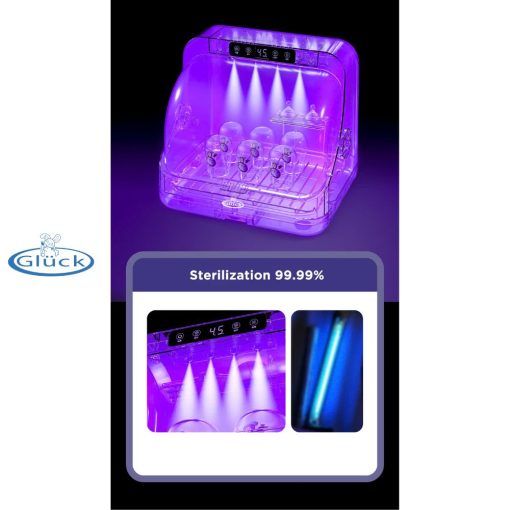 Điểm nổi bật của máy tiệt trùng Gluck GX09 là việc sử dụng đèn LED UV kết hợp với máy sấy. Công nghệ UV này đã được chứng minh là có khả năng tiêu diệt đến 99,99% vi khuẩn, giúp tiệt trùng hoàn toàn các vật dụng như bình sữa, núm ti, đồ chơi và cả những vật dụng gia đình khác mà không cần đến các loại hóa chất có thể gây hại. Nhờ đó, bạn có thể hoàn toàn yên tâm về độ an toàn và sạch sẽ của những vật dụng mà bé tiếp xúc hàng ngày.