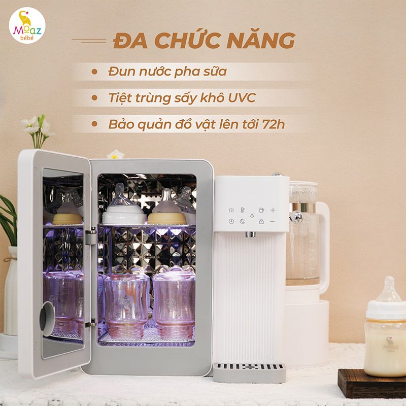 Sản phẩm tích hợp nhiều chức năng hiện đại, loại bỏ vi khuẩn gây hại bám trong từng ngóc ngách của bình sữa, sấy bình sữa khô ráo, bảo quản tự động trong môi trường vô trùng. Bình đun tích hợp có thể nấu nước sôi, khử clo để cung cấp nước tinh khiết, pha sữa an toàn cho bé, đồng thời có thể dùng để pha trà, pha cà phê cho bố mẹ.