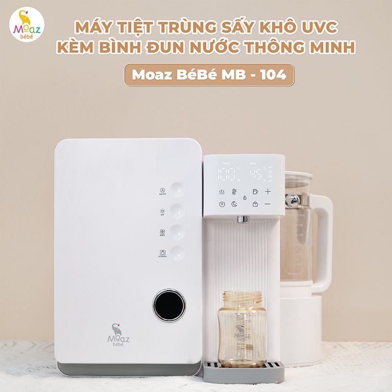 Máy tiệt trùng sấy khô UVC và đun nước thông minh Moaz BéBé MB – 104 là sản phẩm trợ giúp cho hành trình chăm con của các gia đình hiện đại. Thiết bị tích hợp đa chức năng: tiệt trùng, sấy khô, bảo quản, đun sôi, khử clo, lấy nước, điều chỉnh lượng nước, pha trà, pha cà phê, … giúp bố mẹ bảo vệ con an toàn và tiết kiệm nhiều công sức, thời gian hơn.
