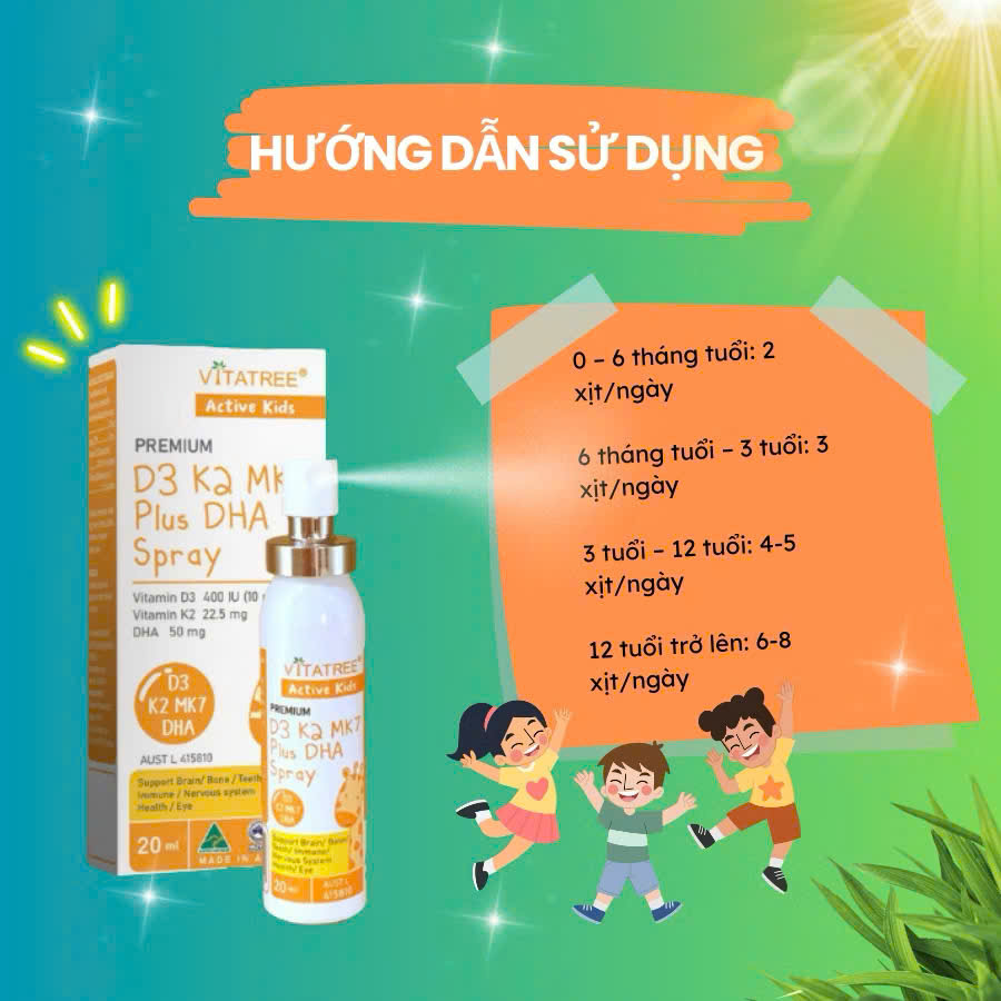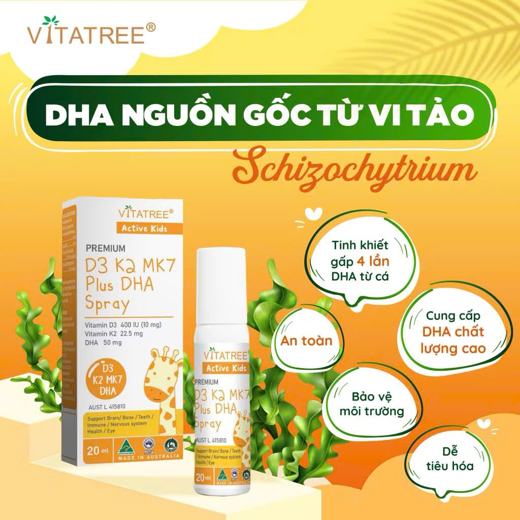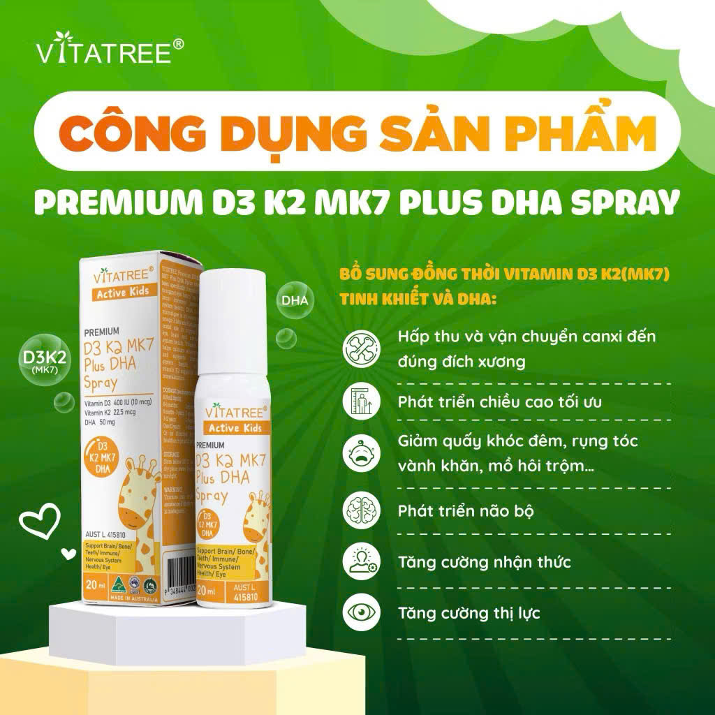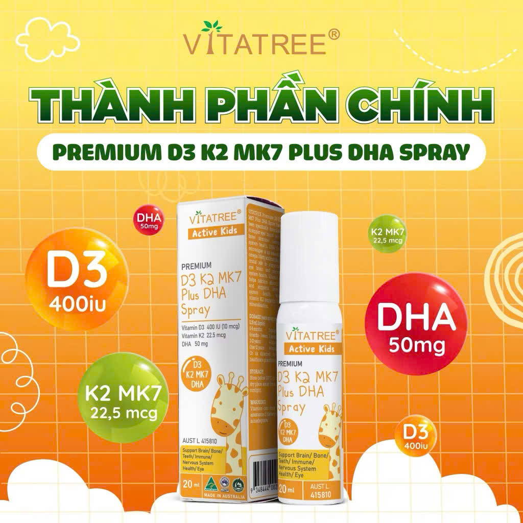Vitatree Premium D3 K2MK7 Plus DHA Spray là sự kết hợp những gì tốt nhất và ưu việt nhất , giúp bổ sung bộ vi chất dinh dưỡng quan trọng và rất cần thiết cho trẻ từ sơ sinh.