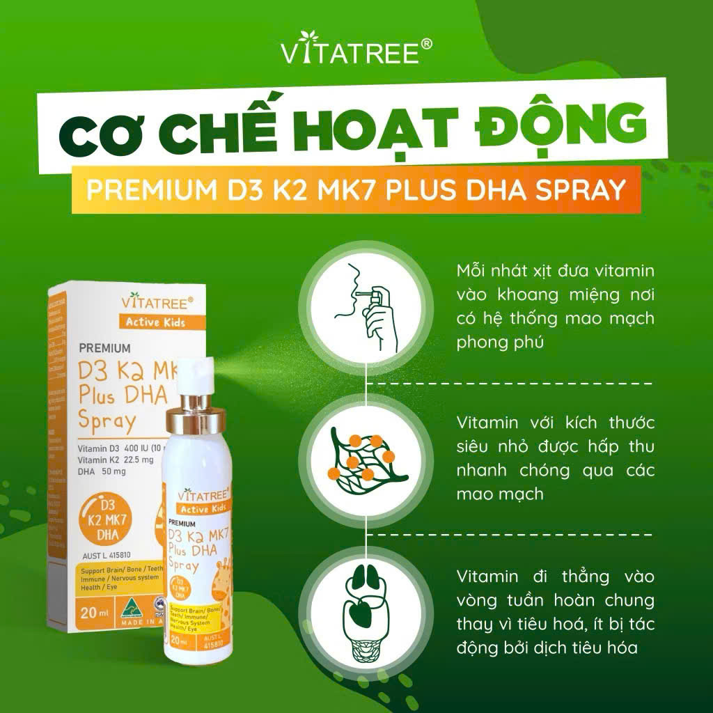 Chai xịt D3K2 Vitatree cơ chế hoạt động mỗi nhát xịt đưa vitamin vào khoang miệng nơi có hệ thống mao mạch phong phú. Vitamin với kích thước siêu nhỏ được hấp thụ nhanh chóng qua các mao mạch. Đi thẳng vào vòng tuần hoàn chung thay vì tiêu hóa, ít bị tác động bởi dịch tiêu hóa.