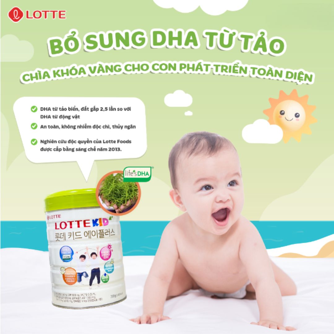 Lotte Wellfood là công ty sản xuất thực phẩm dinh dưỡng đầu tiên chiết xuất thành công DHA từ thực vật tại Hàn Quốc, được đưa vào Lotte Kid A+ giúp dễ hấp thu và đảm bảo an toàn tuyệt đối cho trẻ. DHA trong Lotte Kid A+ được tính toán với tỷ lệ cân đối, được WHO và FAO khuyến khích.
