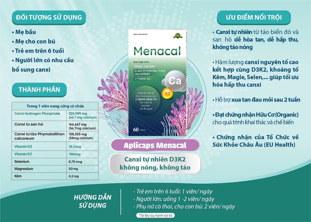 Viên uống Menacal là một trong những dòng sản phẩm nổi bật nằm trong bộ ba vi chất thai kỳ của hãng. Sản phẩm với công dụng chính là bổ sung canxi tự nhiên cùng vitamin D3, vitamin K2 và nhiều khoáng chất quan trọng khác cho cơ thể của mẹ bầu. Đặc biệt, sản phẩm còn được FDA - Cục quản lý Thực phẩm và Dược phẩm Hoa Kỳ chứng nhận an toàn và chất lượng nên mẹ có thể tin tưởng lựa chọn.